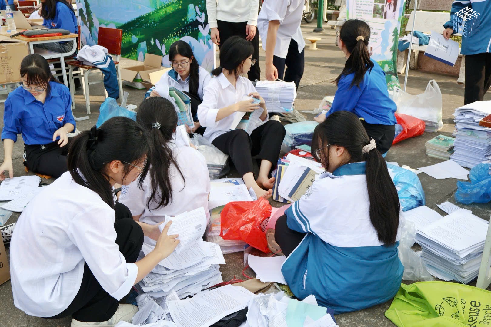 Sau khi thu gom giấy vụn từ các lớp học, học sinh tiến hành phân loại theo từng loại giấy cụ thể. Hoạt động được tổ chức khoa học, cẩn thận, nhằm bảo đảm thuận lợi cho công tác xử lý và tái chế, đồng thời góp phần nâng cao ý thức trách nhiệm của học sinh trong việc bảo vệ môi trường. Bên cạnh công tác thu gom và phân loại giấy vụn, những cuốn sách cũ còn giá trị sử dụng cũng được lựa chọn và phân loại riêng. Số sách này được chuẩn bị cẩn thận để trao tặng cho Tủ truyện dành cho bệnh nhi tại Bệnh viện Nhi Hải Dương, qua đó góp phần lan tỏa tinh thần sẻ chia và mang đến nguồn động viên tinh thần cho các em nhỏ đang điều trị tại bệnh viện.