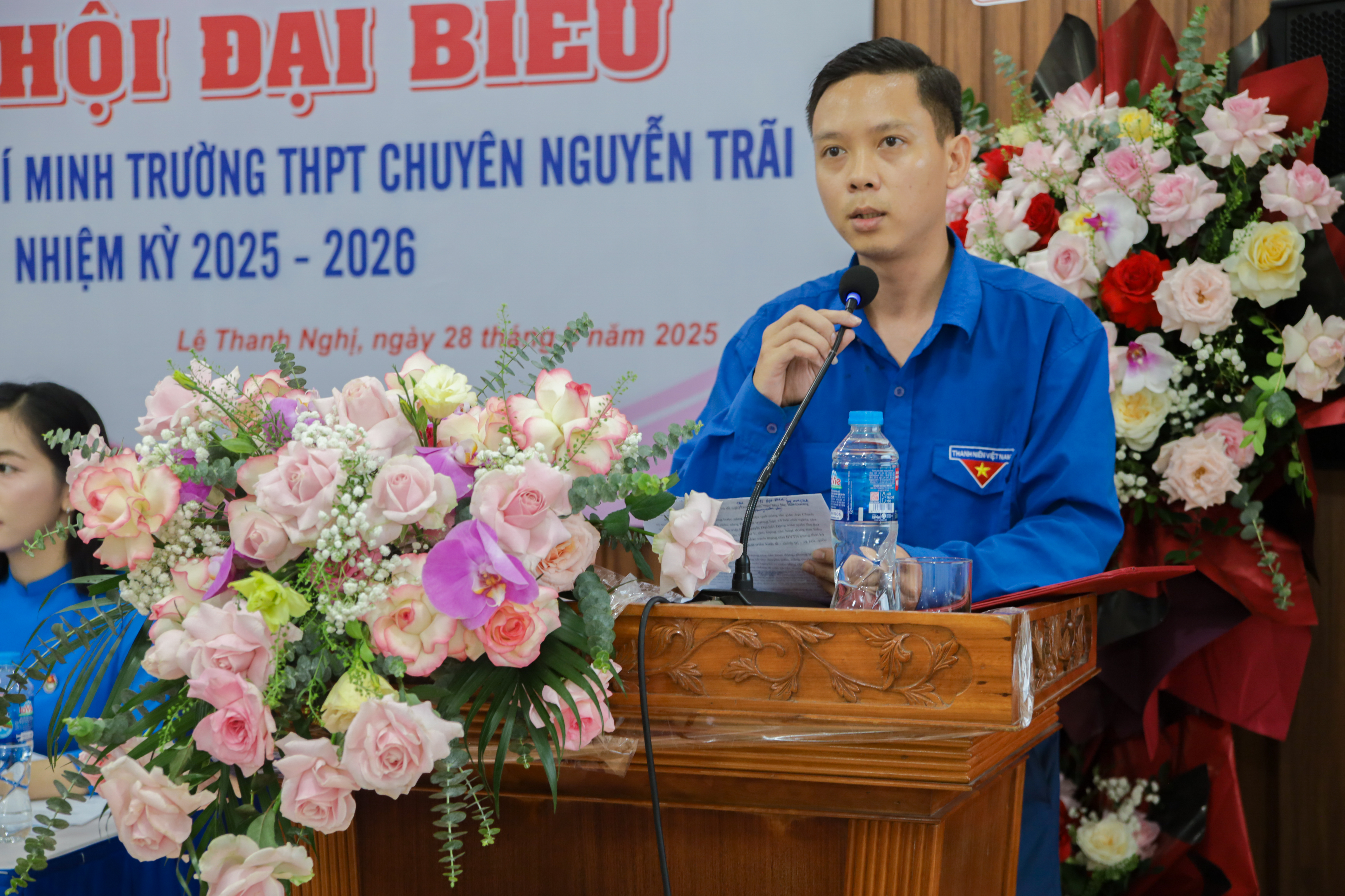Tiếp đó, đồng chí Lê Văn Lục - Bí thư Đảng Ủy, Hiệu trưởng nhà trường, đã phát biểu chỉ đạo nhiệm vụ cho Đại hội. Đồng chí nhấn mạnh về những hành động, công tác của Đoàn đối với trường THPT chuyên Nguyễn Trãi cũng như có tuyên dương đối với những công tác hỗ trợ học sinh của Đoàn trường trong năm học vừa qua.